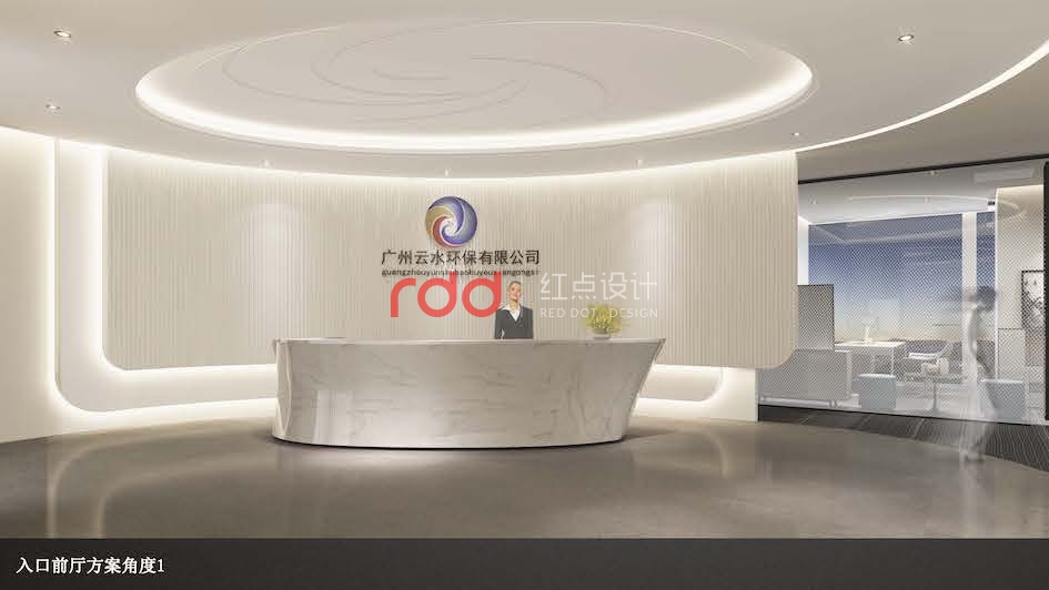 广州美珊园林有限公司是云南水务下的子公司,是以“环保”行业为主的行业公司,为了突出该公司环保的理念,红点装饰的设计师在前厅立面背景及等候区的背景墙上采用弧形的结构,加上大理石的前台,在平面上看犹如母亲的双手呵护的珍珠。天花上logo雕刻与背景墙上的logo形成呼应。