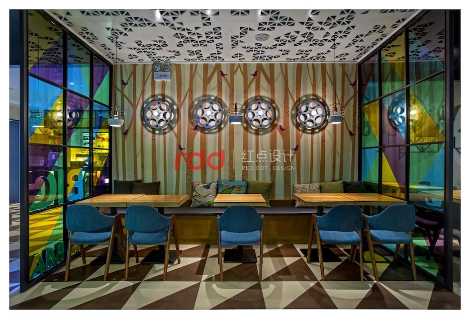 几何元素被设计师大量使用:地板、天花上随处可见的三角形,既突破了寻常空间的方正视觉,又将俏皮与活力纳入餐厅;壁灯则是别致的电影胶卷盘造型,投影在墙上恍若时光的印刻;桌面、落地窗则是矩形的代表,将绚丽多彩纷纷框进空间,形成井井有条的秩序美感;狭长的射灯远眺仿佛一条条墨线垂天而下,让空间纵深感十足。不得不令人感慨,设计师对于快时尚餐饮的拿捏如此到位。